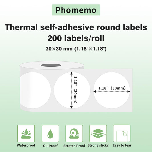 Phomemo Okrągła etykieta M110, wielofunkcyjna etykieta, 30 x 30 mm, kompatybilna z drukarką etykiet Phommeo M200/M110/M120/M220/M220/M221, nadaje się do biura, domu, szkoły, 200 etykiet/rolka