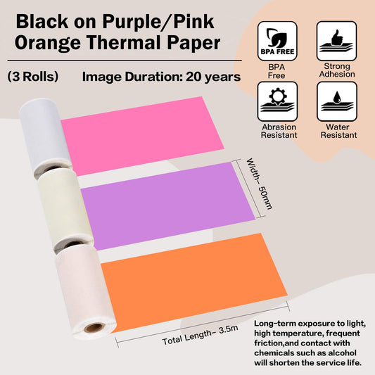 Phomemo Printer Paper - M02/M02Pro/M02S/M03/M03AS/M04S/M04AS Mini Sticker Printer Paper, Purple/Rose Red/Orange Mini Bluetooth Pinter Paper - 50mm x 3.5m Self-Adhesive Sticker Paper, 3 Rolls