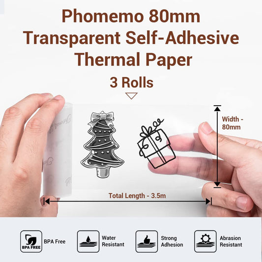Phomemo Przezroczysty papier do drukarek, 80 mm, kompatybilny z M03/M03AS/M04S/M04AS mini drukarka kieszonkowa, 3 rolki samoprzylepnego przezroczystego papieru termoizolacyjnego, 80 mm x 3,5 m, 3
