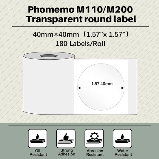 Phomemo Przezroczysta okr?g?a etykieta, samoprzylepna okr?g?a etykieta do drukarek etykiet Phomemo M110, M200, M120, M220, M221, 40 x 40 mm, okr?g?a etykieta, 200 etykiet/rolki
