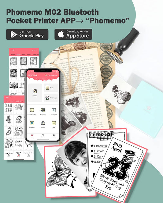 Phomemo Sticker Printer- Mini Printer M02 Portable Thermal Printer Sticker Maker Inkless Pocket Printer Bluetooth Photo Printer for Learning Assistance, Study Notes, Journal, Fun, Work, Receipts