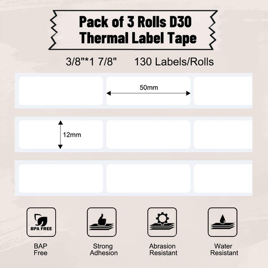 Phomemo 3 Roll Adhesive White Labels for D30 Portable Thermal Label Maker 3/8'' X 1 7/8'' (12mm X 50mm) 130 Labels/Roll, D30 Thermal Printing Label Paper, Black on White