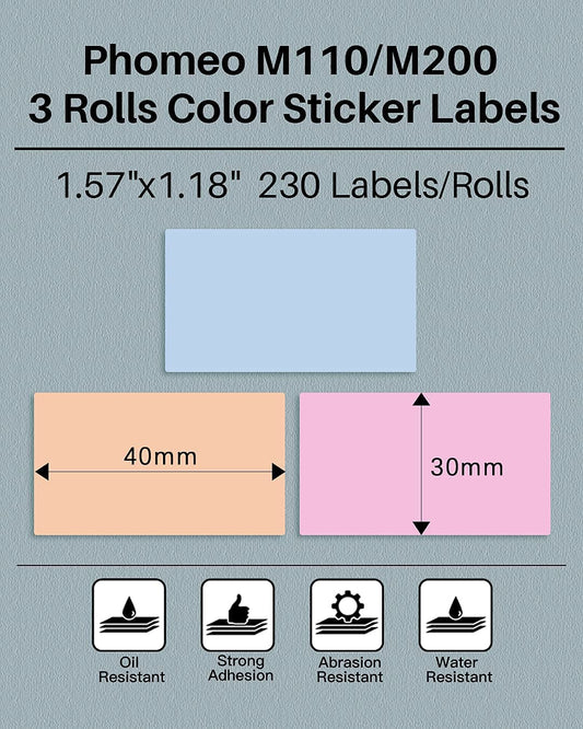 Phomemo 3 Rollen M110 Etikett Thermoetikettenpapier- Multifunktionales selbstklebendes Etikett,Kompatibel mit Phomemo M110 M200 M220 M120 M221 EtikettDruckern,1.57''x1.18'' (40x30mm),230 Etiketten/Rolle.