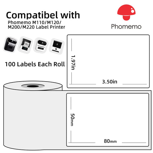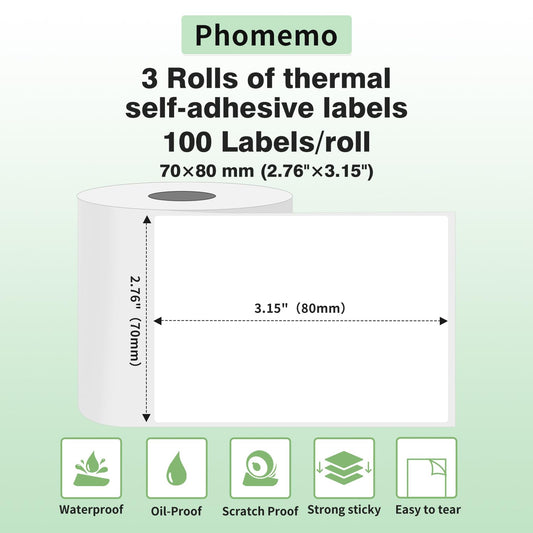 3 Rolls Phomemo M120/M110 Labels, 50 x 80mm (1.97'' x 3.15'') Thermal Label Paper for Phomemo M120/M110/M200/M220 Label Printer, Thermal Label, White Thermal Paper, 100 Labels/Roll