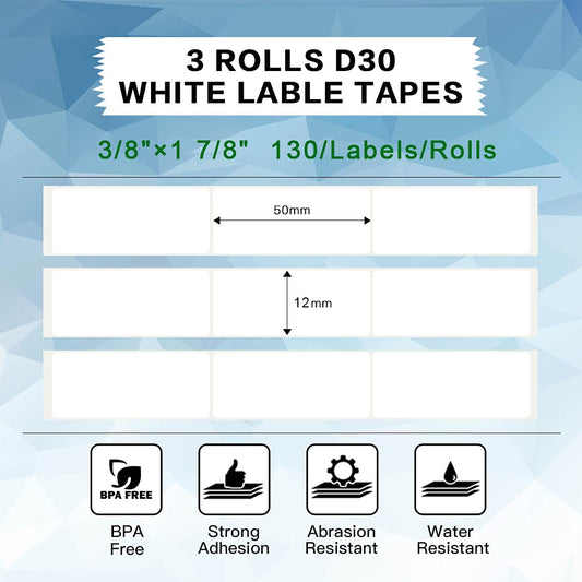 3 rollos Phomemo D30 etiqueta, 12 mm ¡Á 50 mm,Etiqueta autoadhesiva multifuncional D30 compatible con la impresora de etiquetas Phomemo D30, Usado para Hogar, oficina, escuela.130 / rollo, 3 rollos