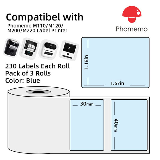 3 Rolls of Phomemo m110 Label 1.57''x1.18'' (40x30mm) Blue Self-Adhesive Direct Thermal Labels, Thermal Label Paper for Phomemo M110/M120/M220/M200/M221 Label Maker, for Barcode, Address, Price etc.