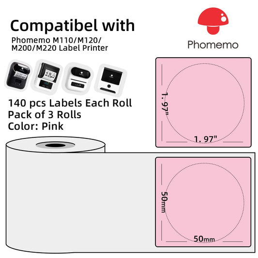 3 rollen van Phomemo Logo Sticker 50x50 mm ronde roze zelfklevende thermische etiketten voor Phomemo M110/M120/M220/M200 labelmaker, gebruikt voor logo afdrukken, huishoudelijke artikelen markering