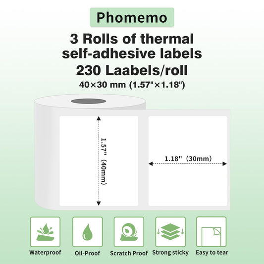 Phomemo 3 rollos etiqueta t¨¦rmica, etiqueta autoadhesiva multiusos para Etiquetadoras Phomemo M110/M200/M120/M220/M221, etiqueta t¨¦rmica, etiqueta de bricolaje, 40 x 30 mm, 230 etiquetas/rollo