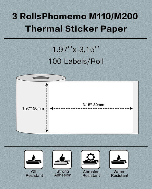 Phomemo 3 rollos Etiquetas térmicas 3 rollos M110 Etiqueta Autoadhesiva Multifunción,1.97''x 3.15''(50x80mm), adecuada para la Etiquetadoras Phomemo M110 M120 M220 M221 M200,100 etiquetas/rollo