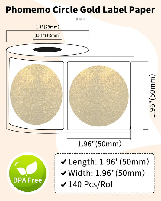 Phomemo 50 x 50 mm Térmica Etiquetas Redonda Phomemo M110 M120 M200 M220 M221 Impresora de Etiquetas para Códigos de Barras,Direcciones,Nombres,Logotipos, Precios, Agradecimientos,Color:Dorado