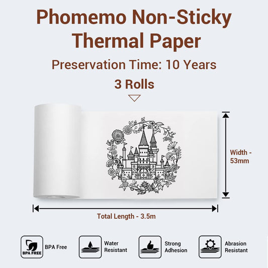 Phomemo 53 mm de papier thermique blanc non adh¨¦sif pour imprimante M03/M03AS/M04S/M04AS 53 mm x 6.5 m 10 ans de conservation noir sur blanc pour journal, texte, notes d'¨¦tude, 3 rouleaux