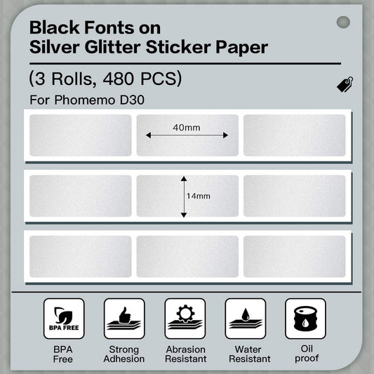 Phomemo D30 3 rolki papieru termicznego - srebrny brokat, naklejka, papier samoprzylepny, 14 x 40 mm