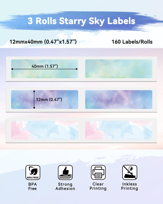 Phomemo D30 Etiketten, Sternenhimmel Etiketten Kompatibel mit Colorwing Q30 Etikettiergerät, Phomemo Etikettendrucker D30 Q31 Q30S, 12mm x 40mm, 160 Etiketten/pro Rolle, 3 Rollen