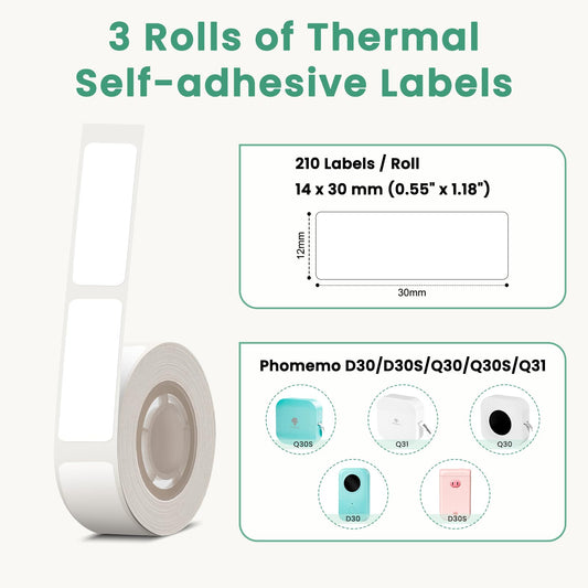 Phomemo D30 Étiquettes, 14 × 30 mm Étiquettes Transparentes Autocollantes pour Imprimante d'étiquettes Phomemo Q30S, Q30, D30, 210 Etiquettes/par Rouleau, 3 Rouleaux