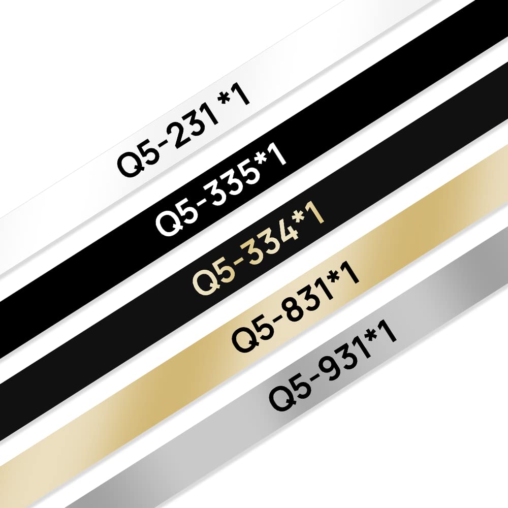 - Verpackung und Farben: 5 Rollen Etikettenbänder in der Verpackung. Farbe: Gold auf Schwarz/Weiß auf Schwarz/Schwarz auf Gold/Schwarz auf Silber/Schwarz auf Weiß. Breite: 12 mm. Länge: 4 m