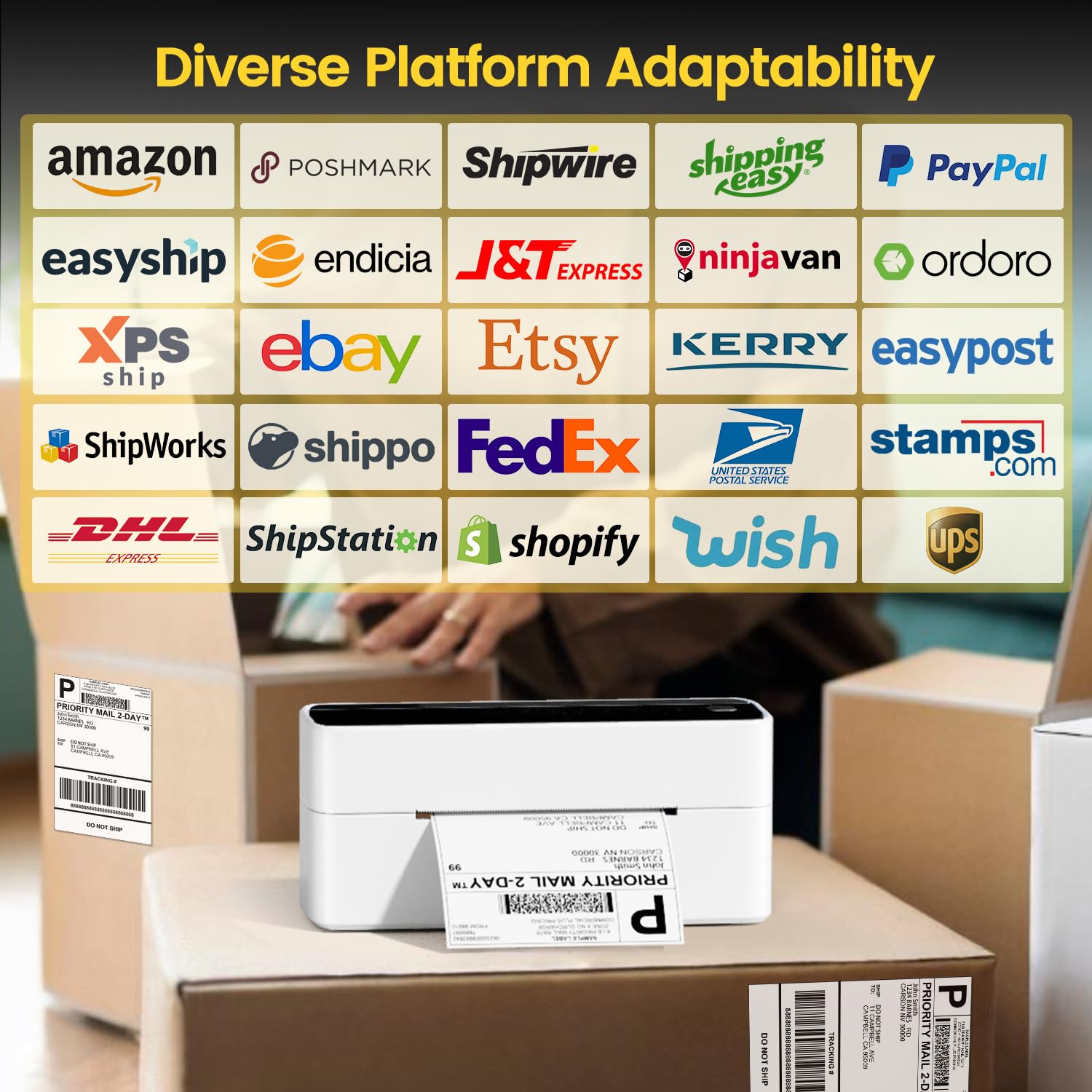 - [Strong platform compatibiliteit] De verzendlabelprinter is compatibel met de meeste platforms zoals eBay, Amazon, Easy, Shopify, ShipStation, enz. Bovendien wordt de thermische labelprinter gebruikt voor verzendverpakkingen voor Hermes, Royal Mail DPD, UPS, DHL en anderen en kan hij worden gebruikt voor thermische labels van 1'' - 4,6'' breed. 4¡Á6 desktop etikettenprinter voor het printen van verzendetiketten, logolabels, bedanketiketten, adresetiketten, barcodelabels en meer.