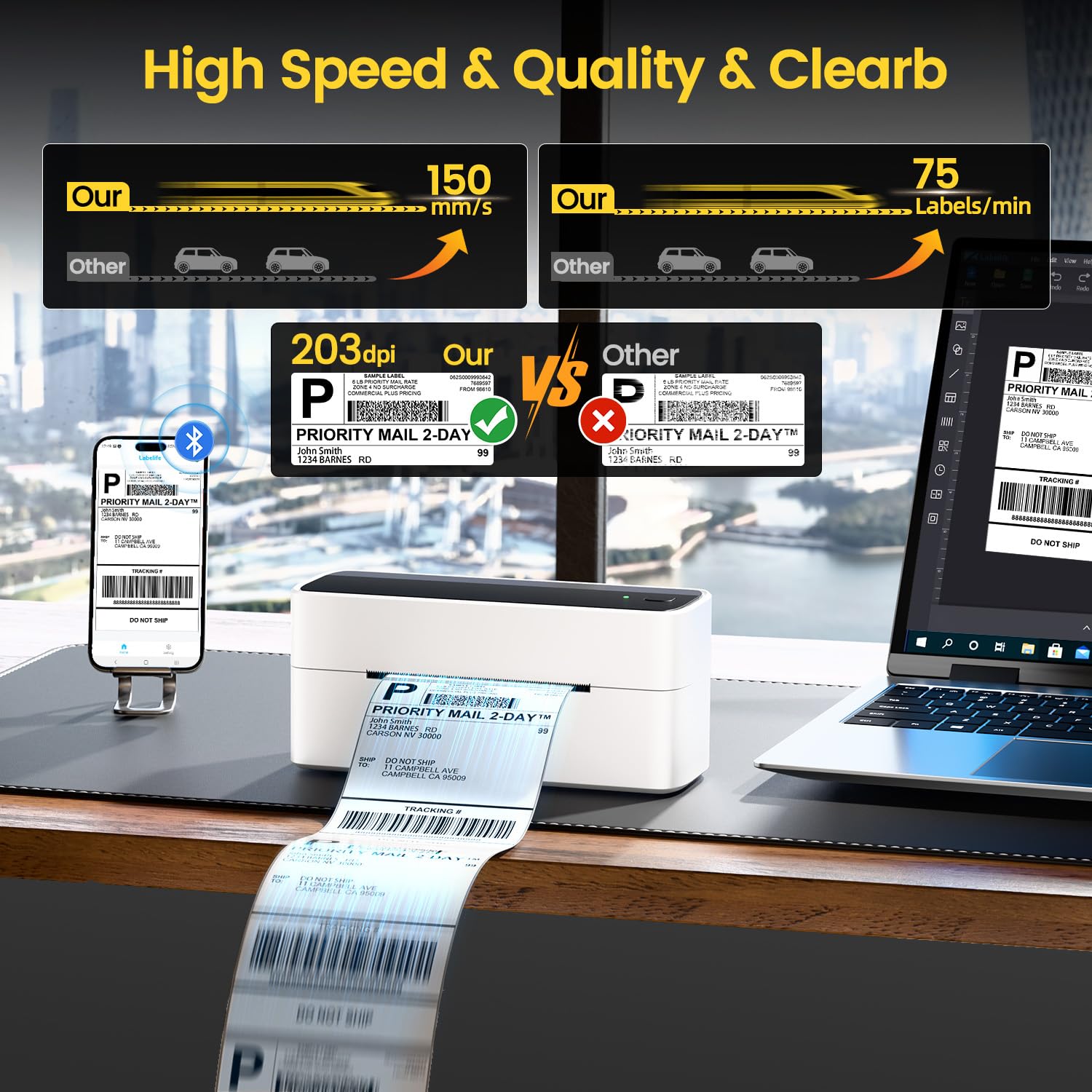 - [Thermische printer voor verzendetiketten]Thermische printer voor verzendetiketten met directe thermische technologie die geen dure inkt of toner nodig heeft, waardoor het onderhoud tot een minimum beperkt blijft en bedrijfskosten vermeden worden. Dankzij de draadloze Bluetooth-connectiviteit behoren rommelige bureaus tot het verleden.
