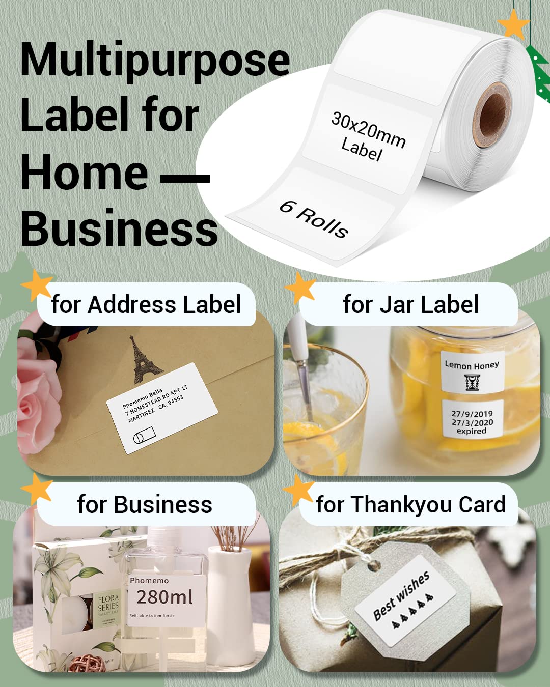 Phomemo 3 rolki etykiet M110, samoprzylepna, 30 mm x 20 mm, 320 etykiet / rolka, kompatybilna z drukarką etykiet Phommeo M200/M110/M220/M120, nadaje się do biura, gospodarstwa domowego, 3 rolki
