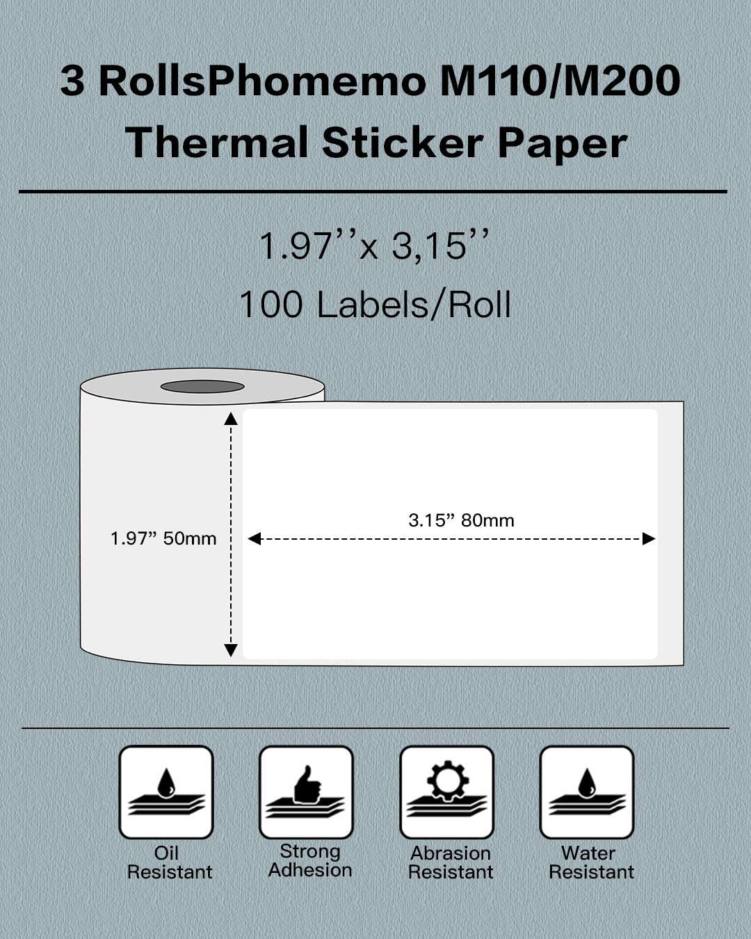 Phomemo 3 rolki papieru do etykiet M110, wielofunkcyjny, samoprzylepny, do Phomemo M110, M200, M120, M220, M221, etykieta, 50 x 80 mm, ??cznie 3 rolki, 100 etykiet/rolka