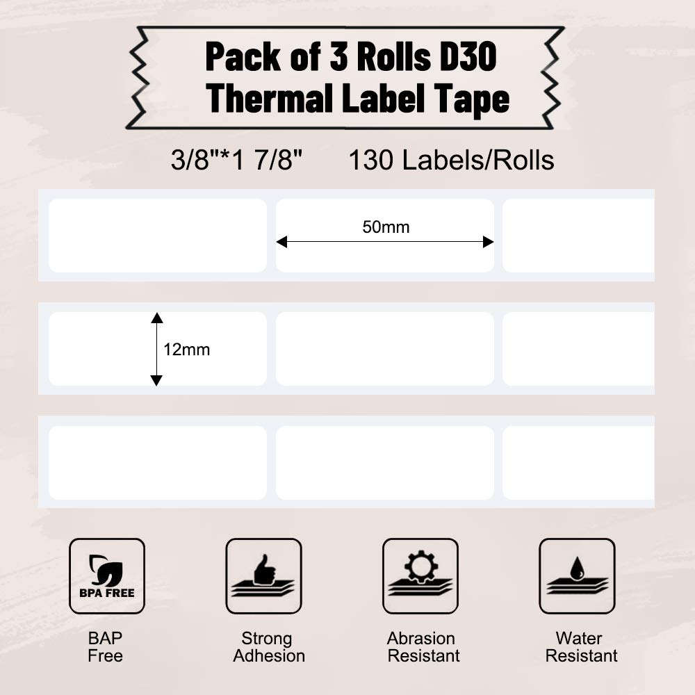 Phomemo 3 Roll Adhesive White Labels for D30 Portable Thermal Label Maker 3/8'' X 1 7/8'' (12mm X 50mm) 130 Labels/Roll, D30 Thermal Printing Label Paper, Black on White