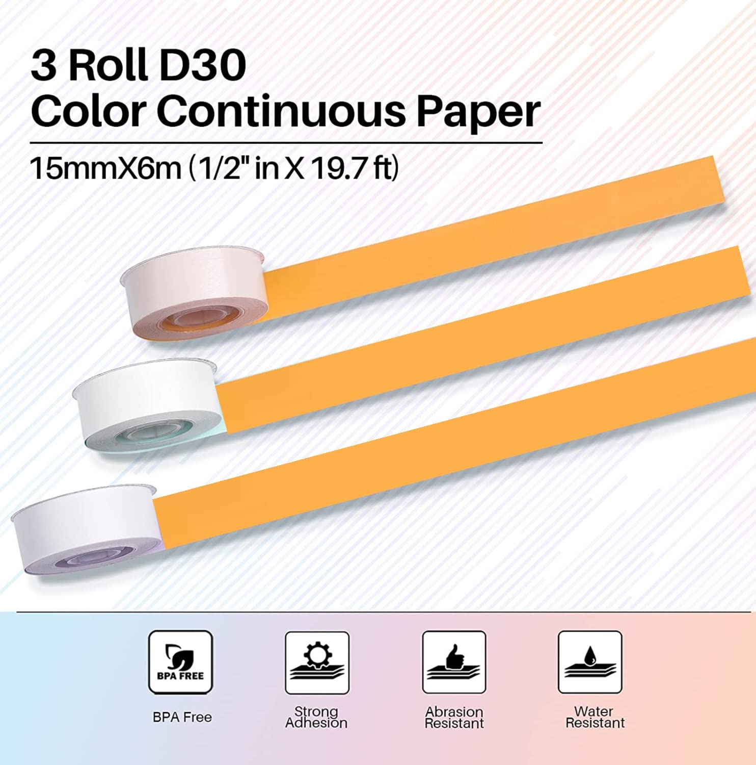 Phomemo 3 Roll D30 Adhesive Continuous Thermal Label Paper 1/2 in X 20 Ft (15mm X 6m) Black on Orange