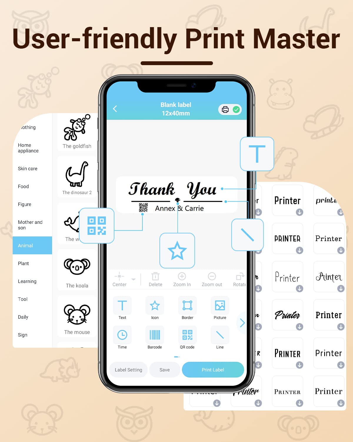 - ¡Ì Easy to use -one-click printing, saving time and effort. Smart app offers variety of fonts, filter effects and themes.Tips for Tips for Using app:Install Print Master App from Apple Store & Google Play->Open the App and Turn on D35 printer->Keep the Bluetooth Setting On and Seach the printer-> Match and finish connection via the app.