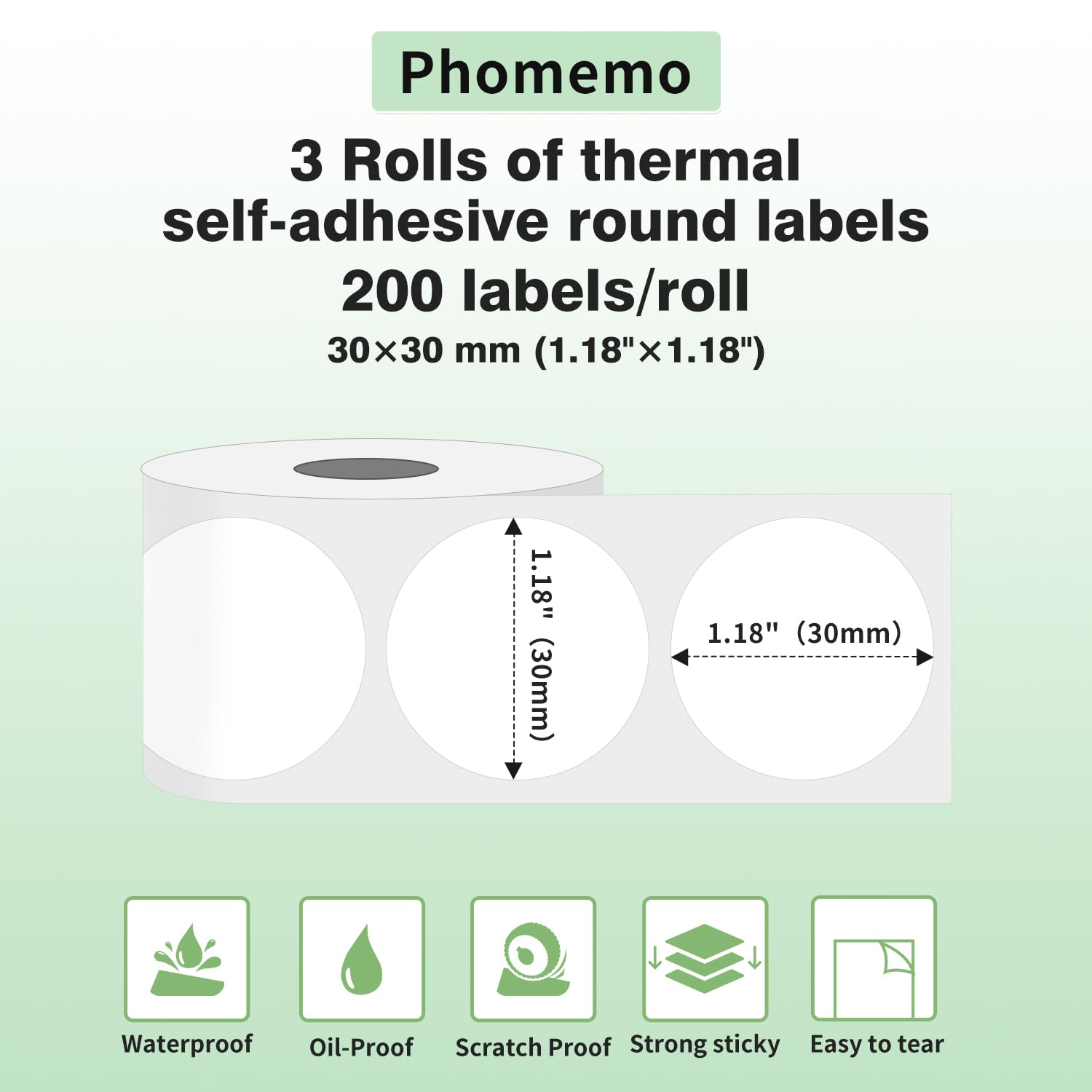 - √ Etiquetas térmicas Especificaciones - Phomemo 3 rollos etiquetas redondas autoadhesivas, Tamaño: 1,18 ''x1,18'' (30x30mm), 200 etiquetas/rollo. Color: etiquetas redondas blancas. Ideal para etiquetas de precios, códigos de barras/códigos QR, diseños de logotipos DIY, etiquetas de nombre, etiquetas de precios, tarjetas de agradecimiento, direcciones, diseños de marca y mucho más.