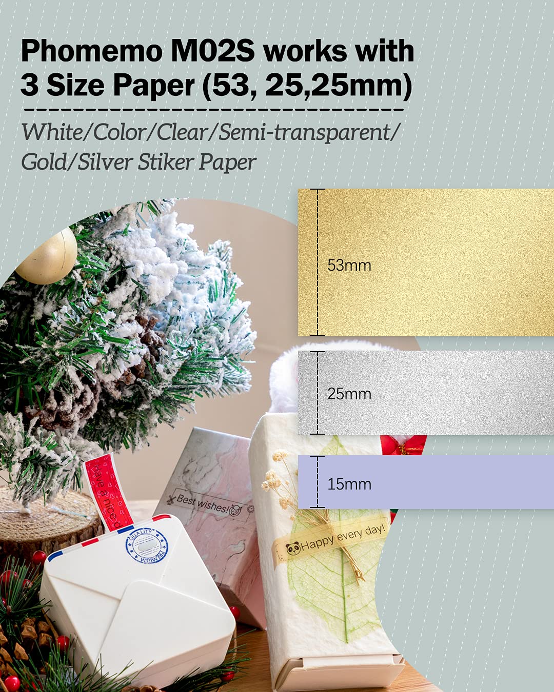 - ¡Ì 300dpi HD Phone Printer- Phomemo M02S mini printer is a 300dpi printer. The image printing is more clear and high-definition. Mini size convenience to take it any where. With 1pcs 53mm White Sticker Paper, 1pcs 25mm Transparent & Semi-Transparent Paper, 1pcs Rose/Purple/Orange 15mm Paper.