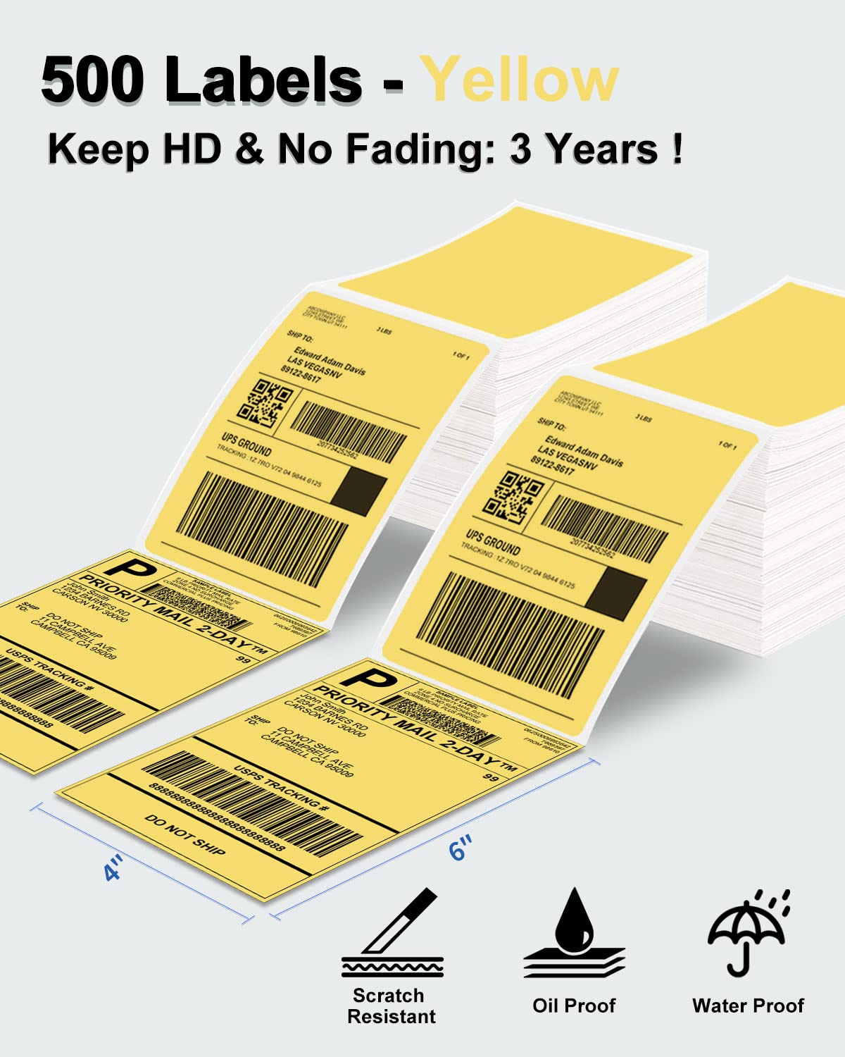 Phomemo 4x6 Thermal Label Printer Paper - 500PCS Yellow 4''x6'' Fan-Fold Label Shipping Supplies Labels - Water/Oilproof Label Stickers - Permanent Adhesive Thermal 4x6 Label for Small Business Supplies