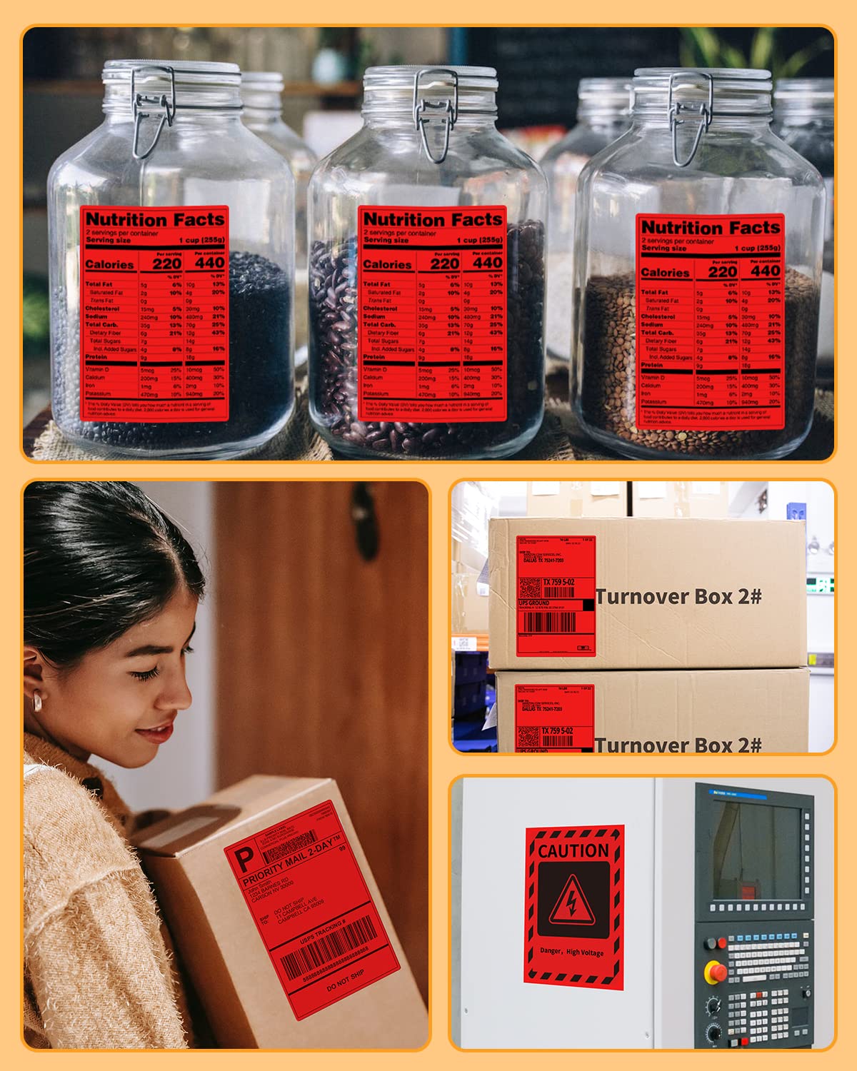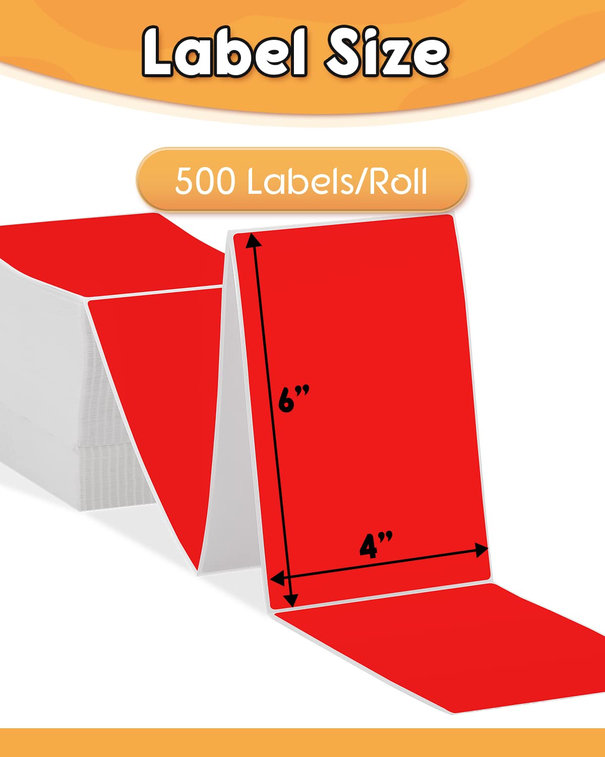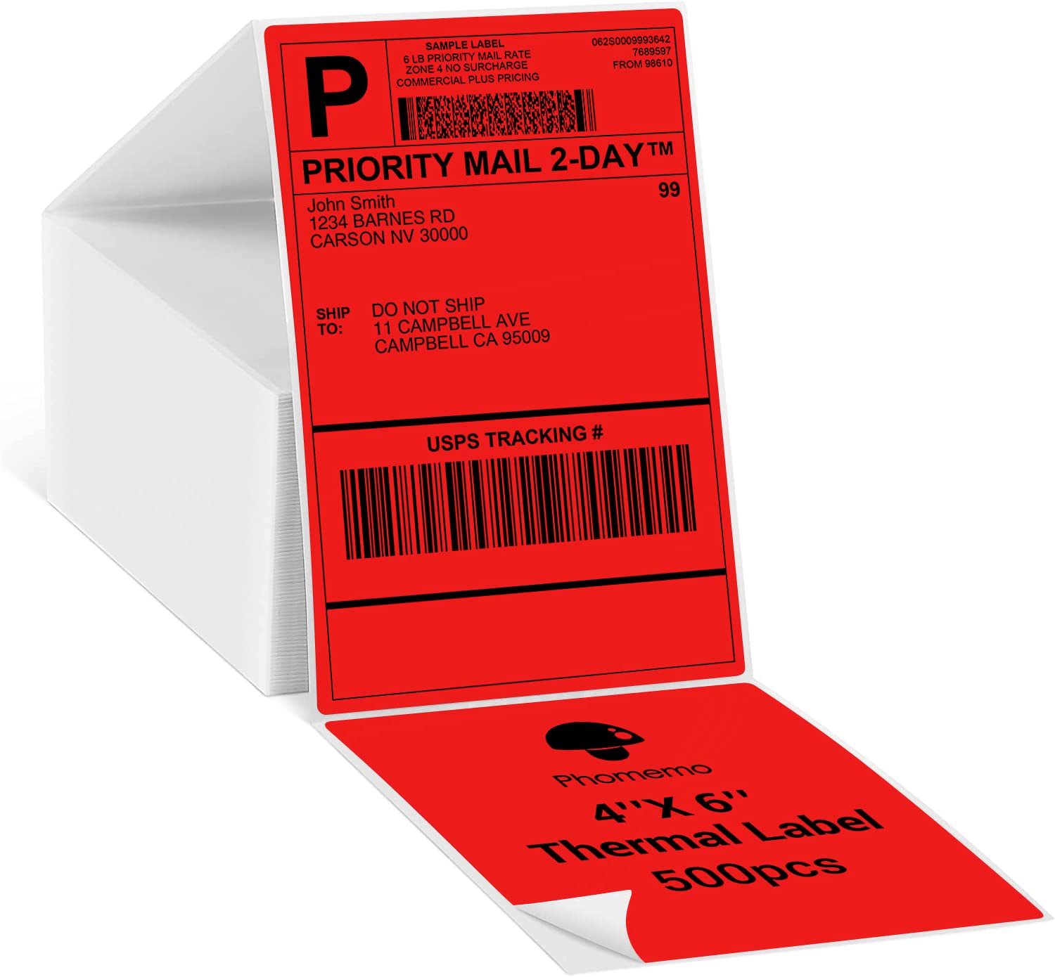 Phomemo 4x6 Thermal Paper Printer Label Thermal Direct Shipping Label Package Labels Compatible with Rollo Phomemo and Other 4 * 6 Label Printer (Pack of 500 4''x 6'' Fan-Fold Labels), Red