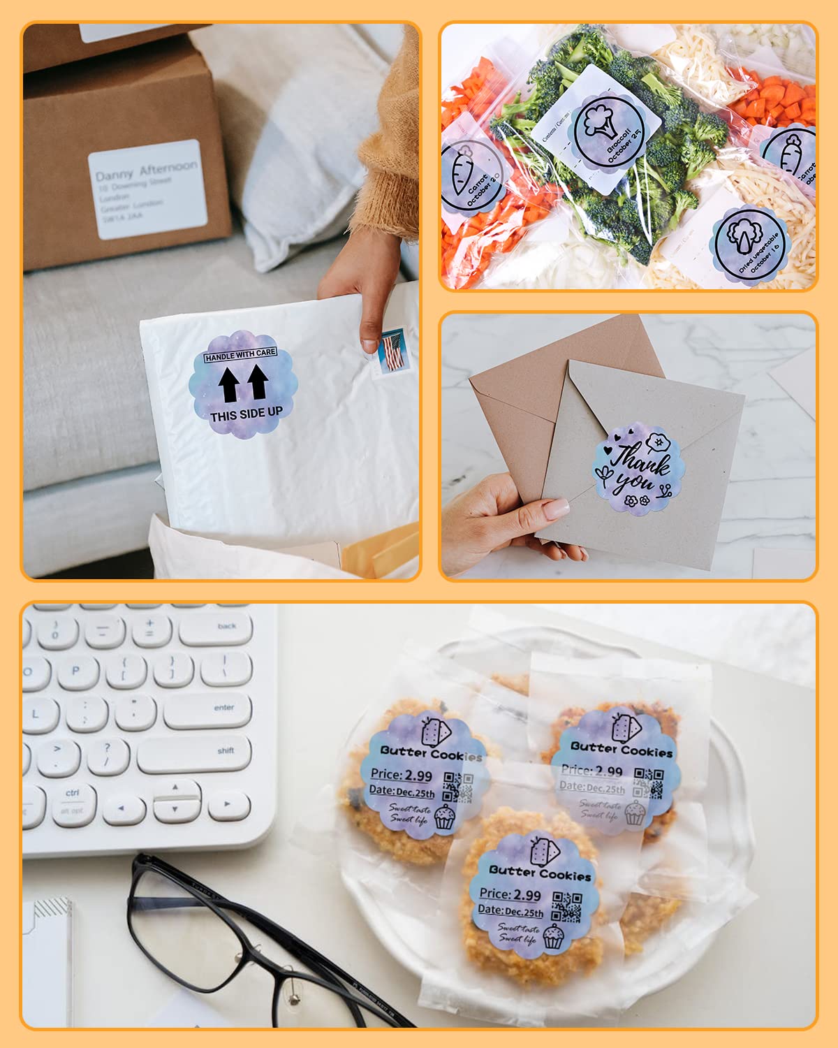 Phomemo 5 in? dalgal? termal etiketler, kendinden yap??kanl? ?i?ek ??kartmas?, te?ekk¨¹r kart?, logo, isim, fiyat, adres, QR kodu, 500 etiket, mavi-mor ge?mi?