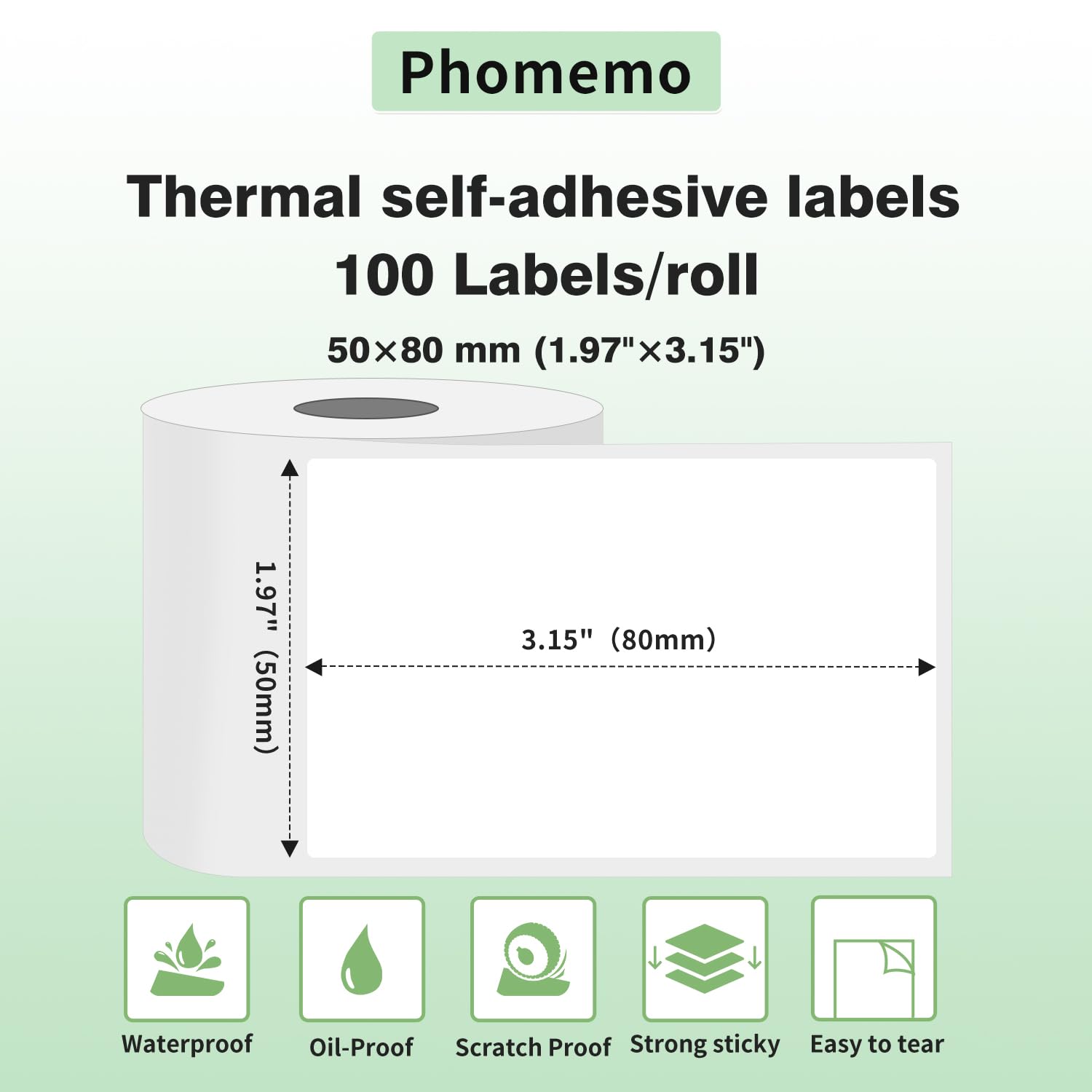 • Thermo-Etiketten Spezifikationen - 6 Rollen Phomemo selbstklebende wei?e Etiketten, Gr??e: 1,96? x 3,15'' (50x80 mm), 100 Etiketten/Rolle. Farbe: wei?es Rechteck. Ideal f¨¹r Preisschilder, 1D/2D-Codes, DIY-Logo-Designs, Namensschilder, Preisschilder, Dankeskarten, Adressen, Branding-Designs und mehr
