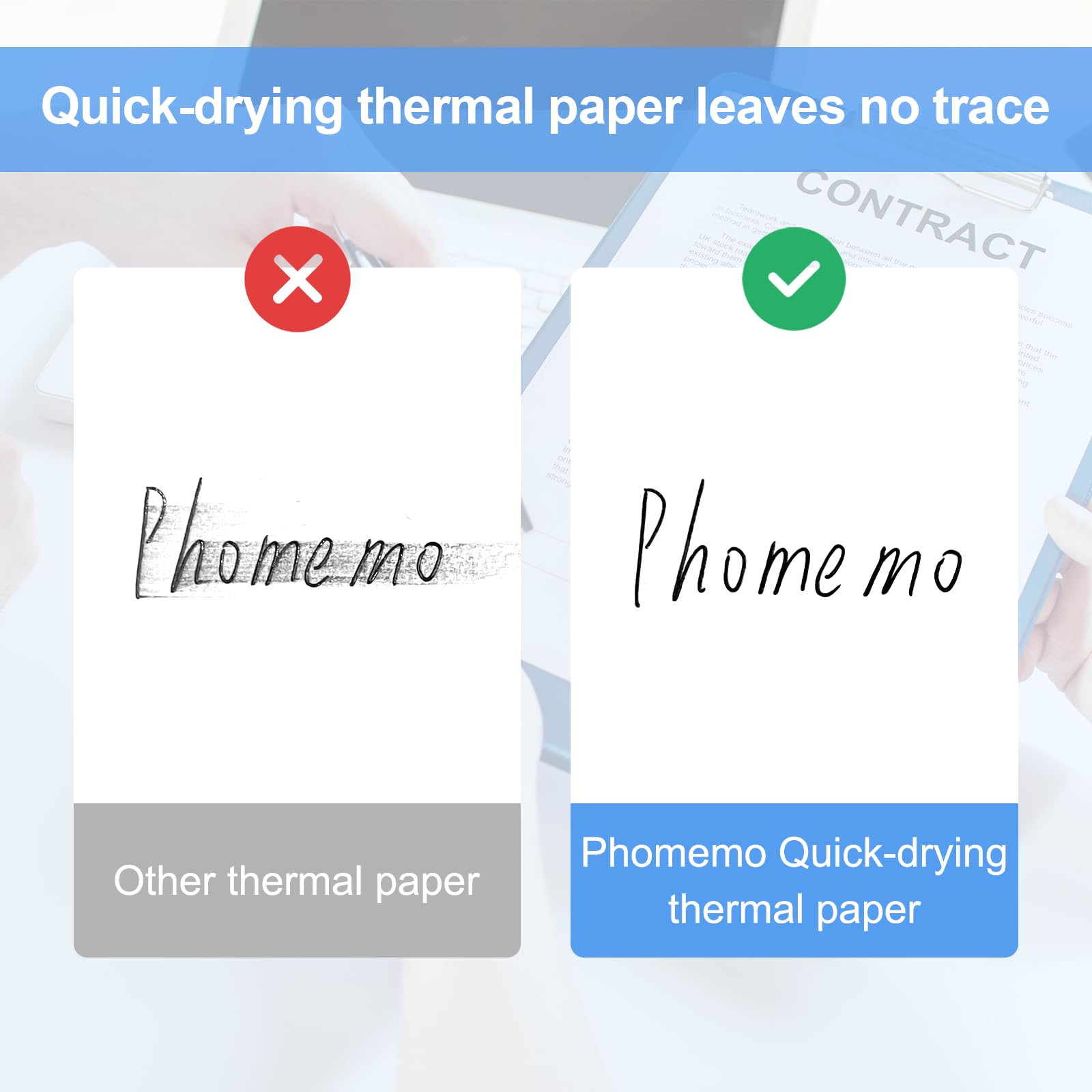 - Phomemo A4 thermal paper prints clearly and does not leave print marks, the writing will not become blurred or blackened, and there is a coating on the surface that allows the writing to dry quickly. It is also waterproof, oil-proof and abrasion-resistance.