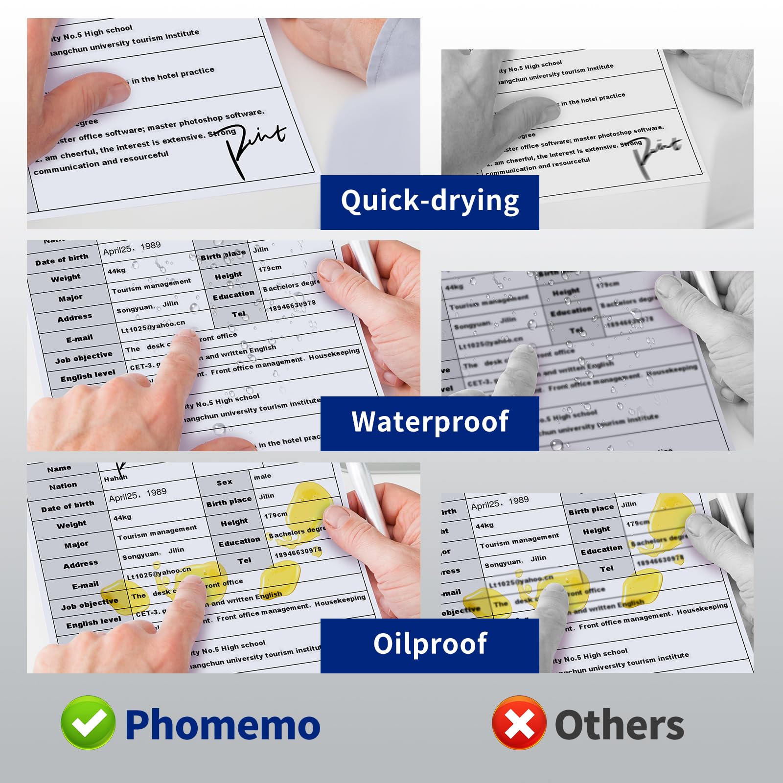 - Phomemo A4 thermal paper prints clearly and does not leave print marks, the writing will not become blurred or blackened, and there is a coating on the surface that allows the writing to dry quickly. It is also waterproof, oil-proof and abrasion-resistance.