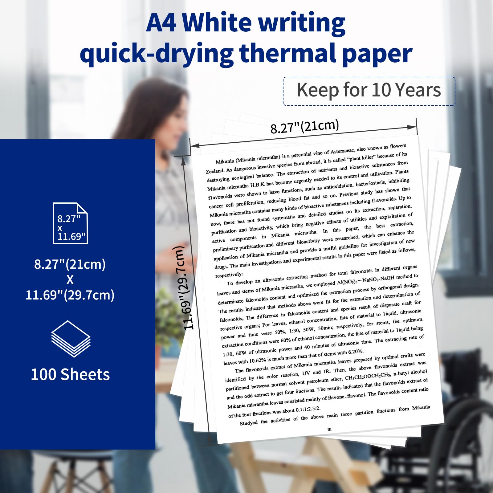 - Phomemo A4 white quick-dry Thermal Paper, 8.27''x11.69'' (210mm*297mm) width, black text, 100 sheets in box. Compatible with Phomemo M08F/M832/M833/M834 portable A4 printer. Storage for 10 years.