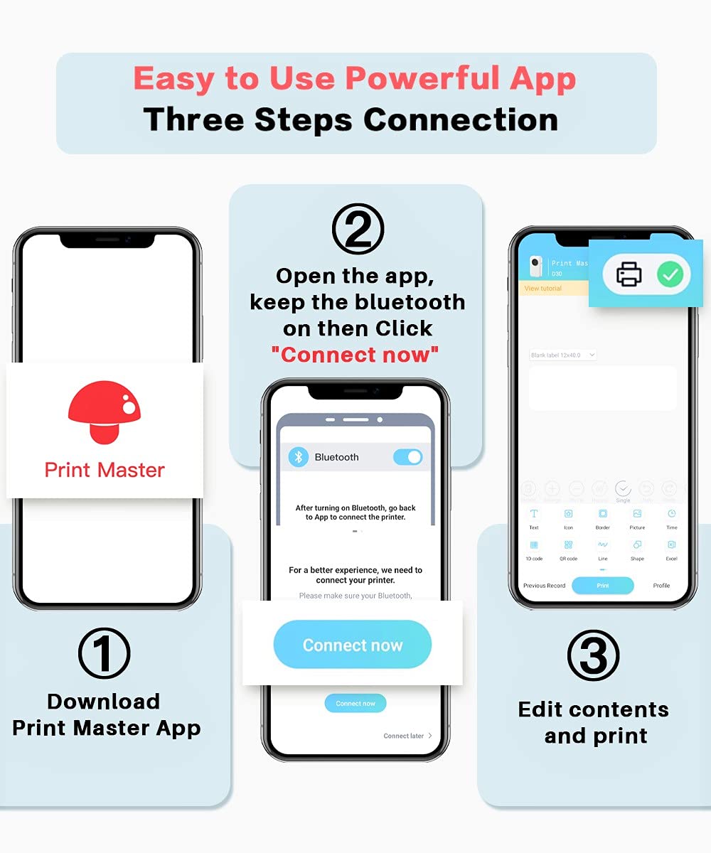 - ¡Ì Easy to use -one-click printing, saving time and effort. Smart app offers variety of fonts, filter effects and themes. Using app: Install Print master App from Apple Store & Google Play->Turn on D30 printer and open bluetooth connection.Choosing printer model D30 from app->Enjoy Printing.