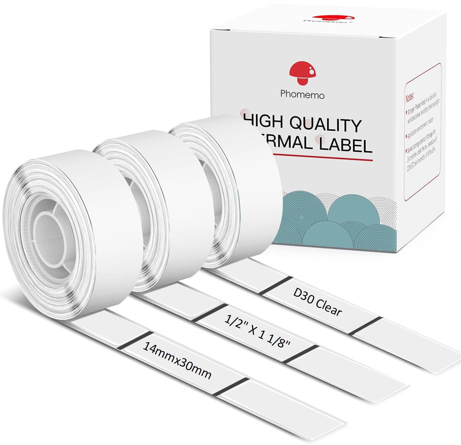 Phomemo Adhesive Clear Labels for D30 Portable Thermal Label Maker 1/2'' X 1 1/8'' (14mm X 30mm) 210 Labels/Roll, D30 Thermal Printing Label Paper, Black on Clear, 3 Roll