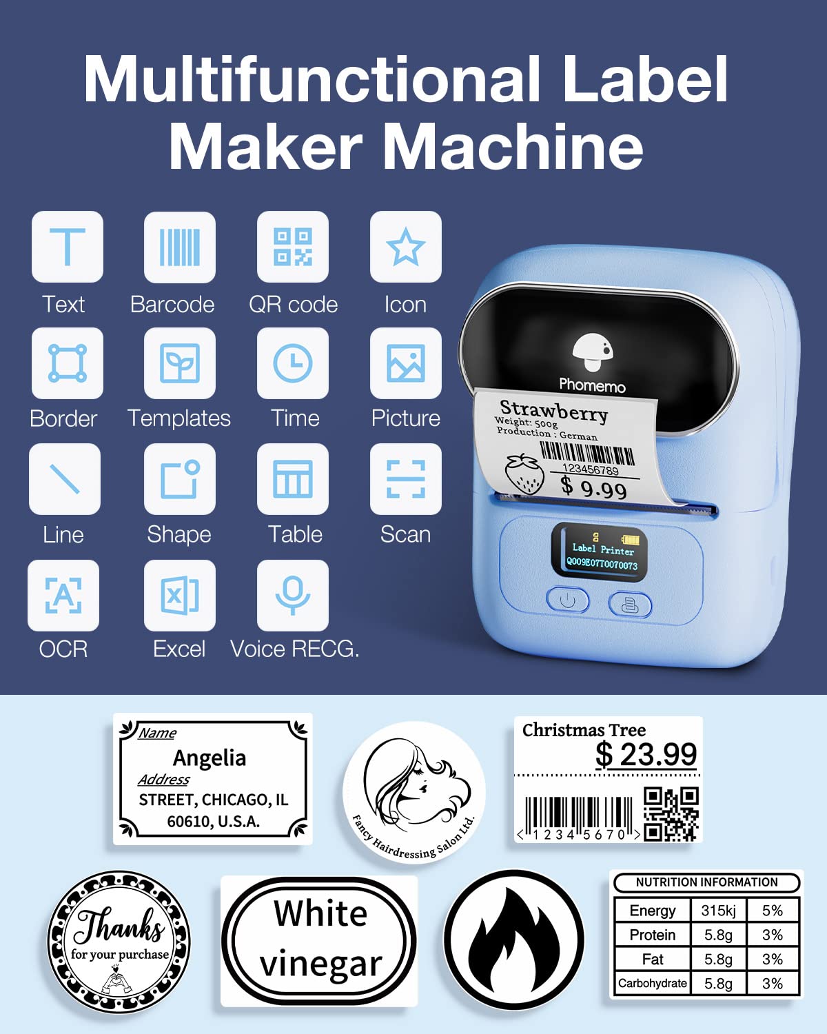 - User-friendly Powerful APP - Phomemo M110 label maker machine works with our app ''Print master''. More than 100+ free label templates, 13 languages, can print text, barcode, Icon, picture, tabel ect. Freely edit your own labels. One click to batch printing, save your time and efforts on business