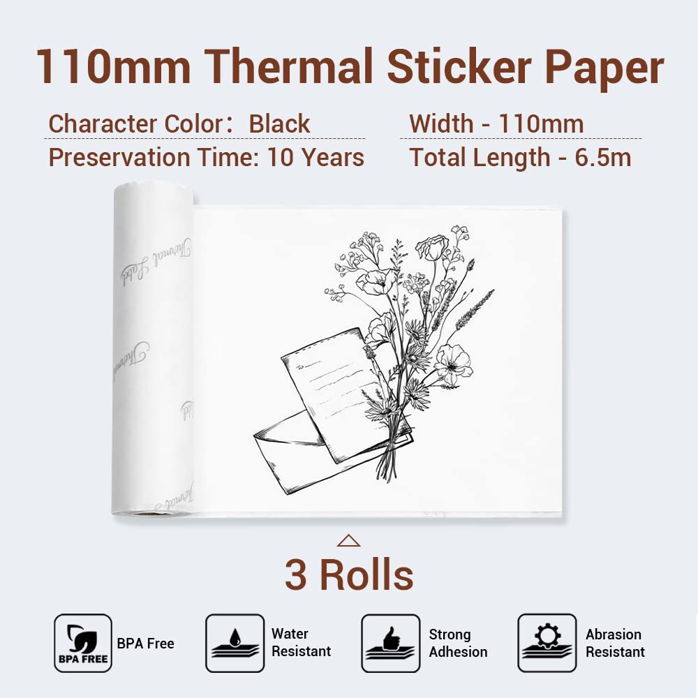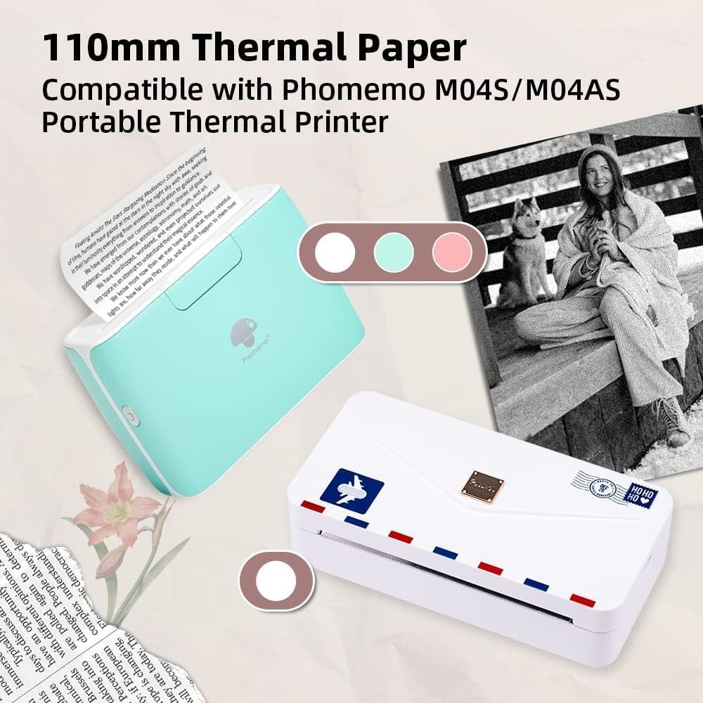 Phomemo Biały samoprzylepny papier termiczny 110mm, kompatybilny z Phomemo M04S/M04AS bezprzewodowa drukarka do telefonów komórkowych, 110mm x 3,5m (4,33 ''x 138''), czasopism, edukacji,naklejek,3 rolki