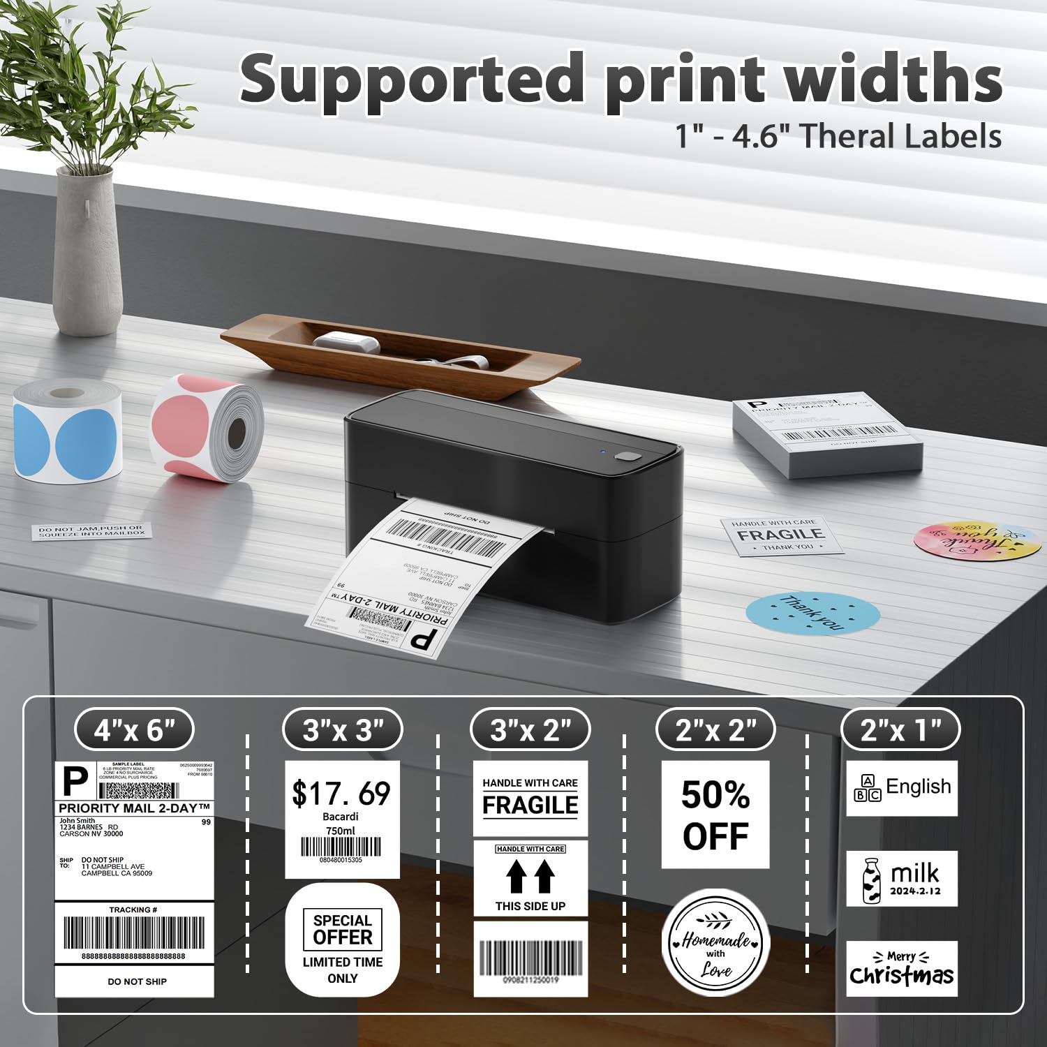 - [Strong platform compatibiliteit] De verzendlabelprinter is compatibel met de meeste platforms zoals eBay, Amazon, Easy, Shopify, ShipStation, enz. Bovendien wordt de thermische labelprinter gebruikt voor verzendverpakkingen voor Hermes, Royal Mail DPD, UPS, DHL en anderen en kan hij worden gebruikt voor thermische labels van 1'' - 4,6'' breed. 4¡Á6 desktop etikettenprinter voor het printen van verzendetiketten, logolabels, bedanketiketten, adresetiketten, barcodelabels en meer.