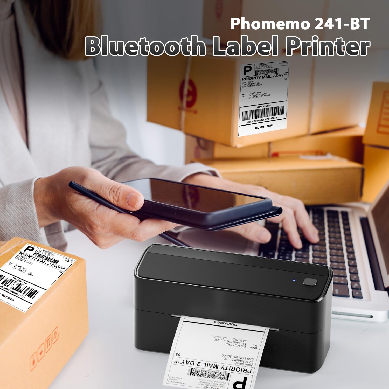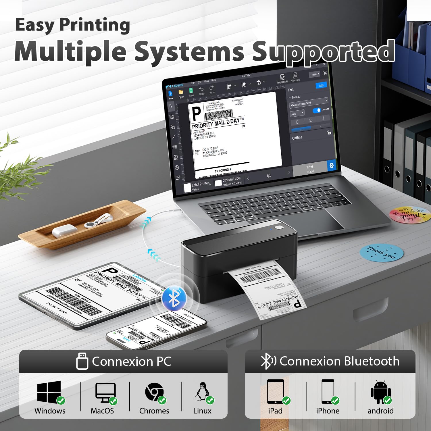 - [Thermische printer voor verzendetiketten]Thermische printer voor verzendetiketten met directe thermische technologie die geen dure inkt of toner nodig heeft, waardoor het onderhoud tot een minimum beperkt blijft en bedrijfskosten vermeden worden. Dankzij de draadloze Bluetooth-connectiviteit behoren rommelige bureaus tot het verleden.