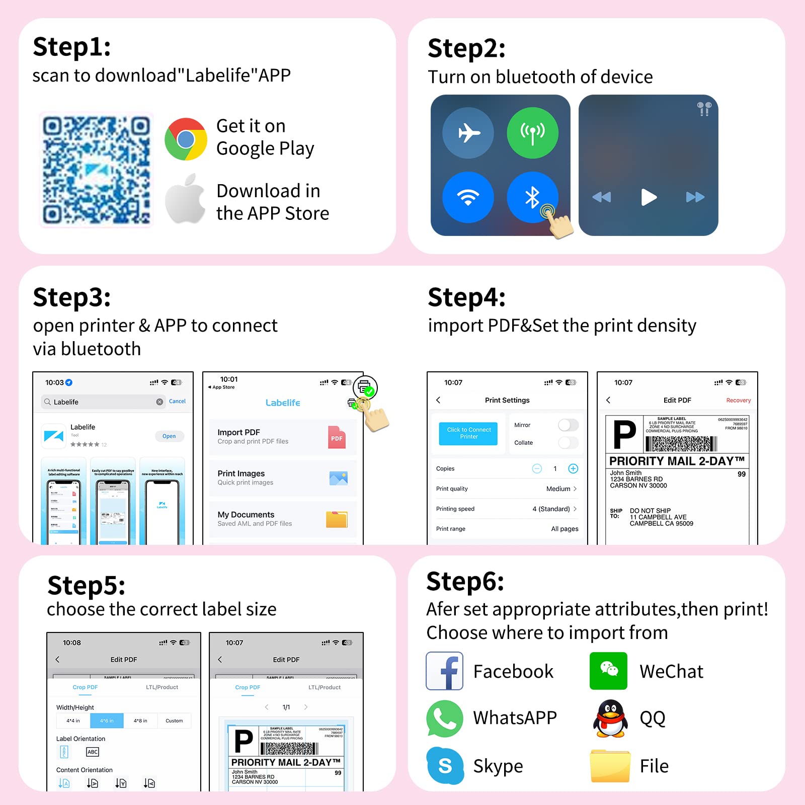 - [Bluetooth & USB Label Printer] - Our powerful shipping label printer: ¢ÙNot only do support printing only with a smartphone/tablet, connected with bluetooth, (bluetooth connection for iOS, Android); ¢ÚBut also can support printing with a computer, connected with a USB cable, (USB connection for Windows, Mac, Linux).(All platforms printing, please firstly remember to download labels on the platform, then upload labels to the editor APP ''Labelife'' for printing).