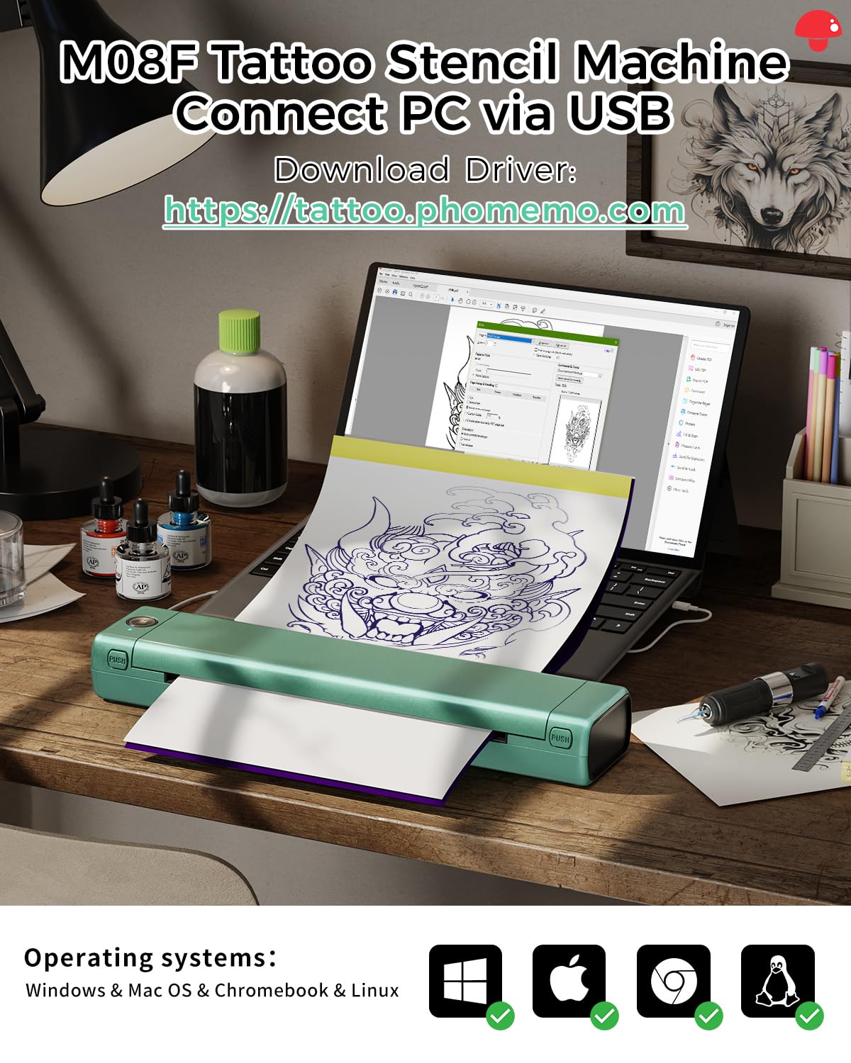 - Multiple Connectivity Options: Phomemo M08F thermal tattoo printer is compatible with a variety of devices, including smartphones, tablets, laptops, and desktop computers. Smartphones and tablets can connect via Bluetooth, while laptops and desktop computers require a USB data cable for connection. The M08F tattoo printer is compatible with various operating systems, such as Android, iOS, Windows, MacOS, and ChromeOS, catering to the diverse needs of users.
