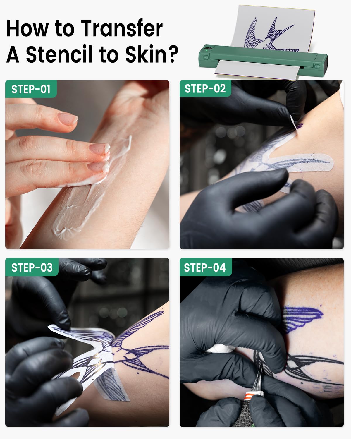 - Rechargeable and Large Capacity Battery - The M08F wireless Bluetooth tattoo printer is equipped with a 1200mAh large capacity battery. With just one full charge, you can print up to 140 pages of light-colored images or text without worrying about charging while on the go. This tattoo printer kit also comes with 10 sheets of tattoo transfer paper and a storage box. Extremely portable and easy to carry.
