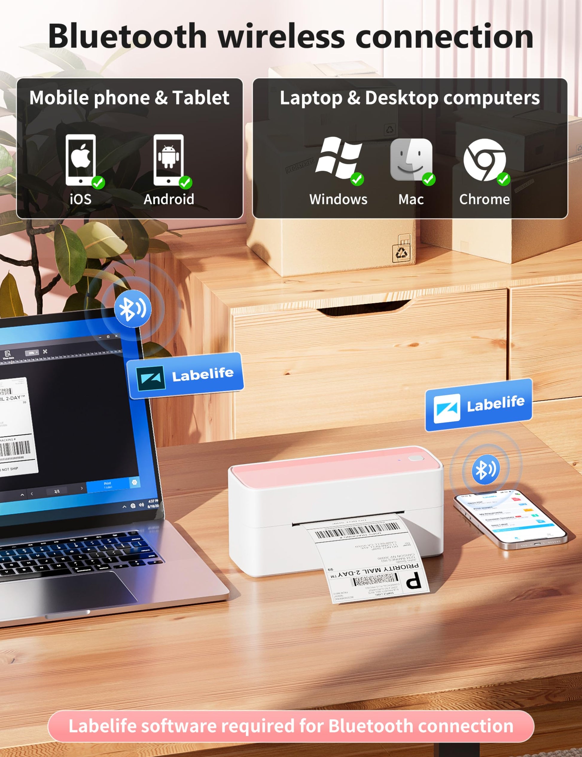 - [Print Wirelessly] - Phomemo bluetooth shipping label printer supports wireless printing through bluetooth connection. For IOS and Android, need to download the ''labelife '' APP from Apple Store or Google Play. With easy and simple operations, you can easily print your documents, photos, and more, making your life more convenient!