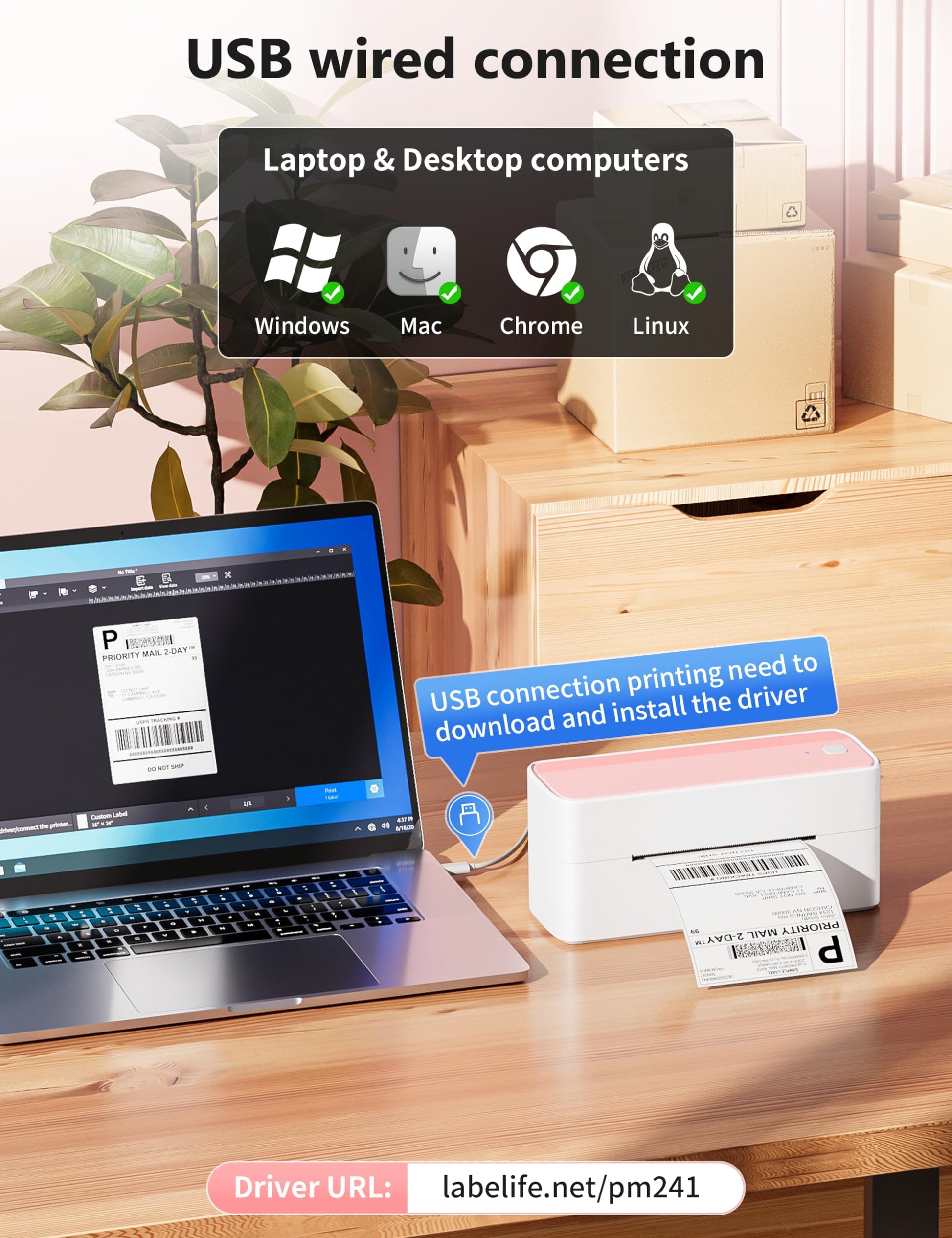 - [Print via USB Cable] - The bluetooth thermal label printer supports USB cable connection. For PC, Windows, Mac OS, Chrome OS, and Linux systems. For Chrome OS, need to enter ''Labelife'' in the chrome web store and add the extension to your Google Chrome. (PC printing needs to download the driver: labelife.net/pm241)