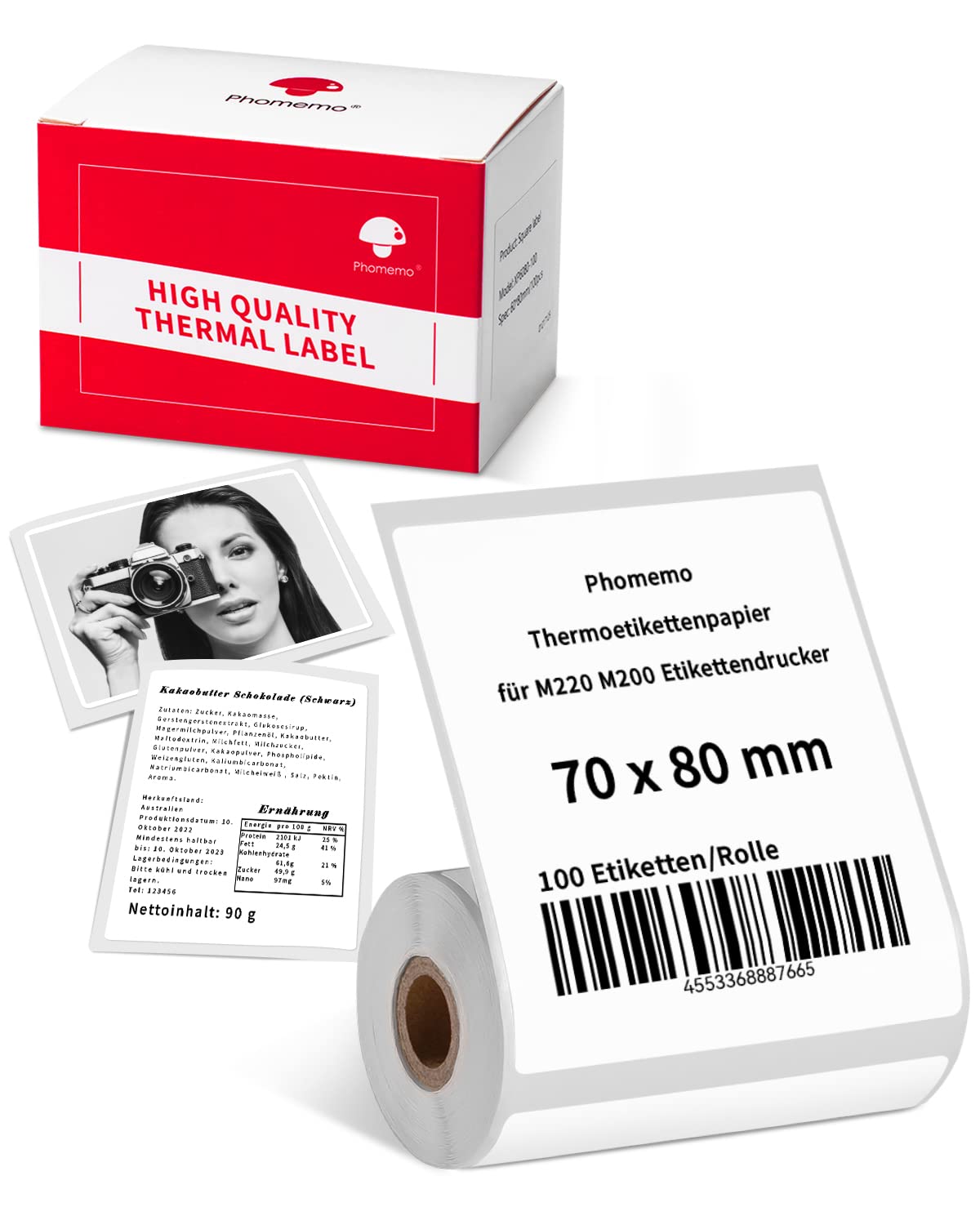 Phomemo Carta termica per stampante per etichette M220 M200 – Etichetta autoadesiva multifunzione, per ufficio, magazzino, etichette indirizzi, trasporto. 70 x 80 mm, 100 etichette/rotolo