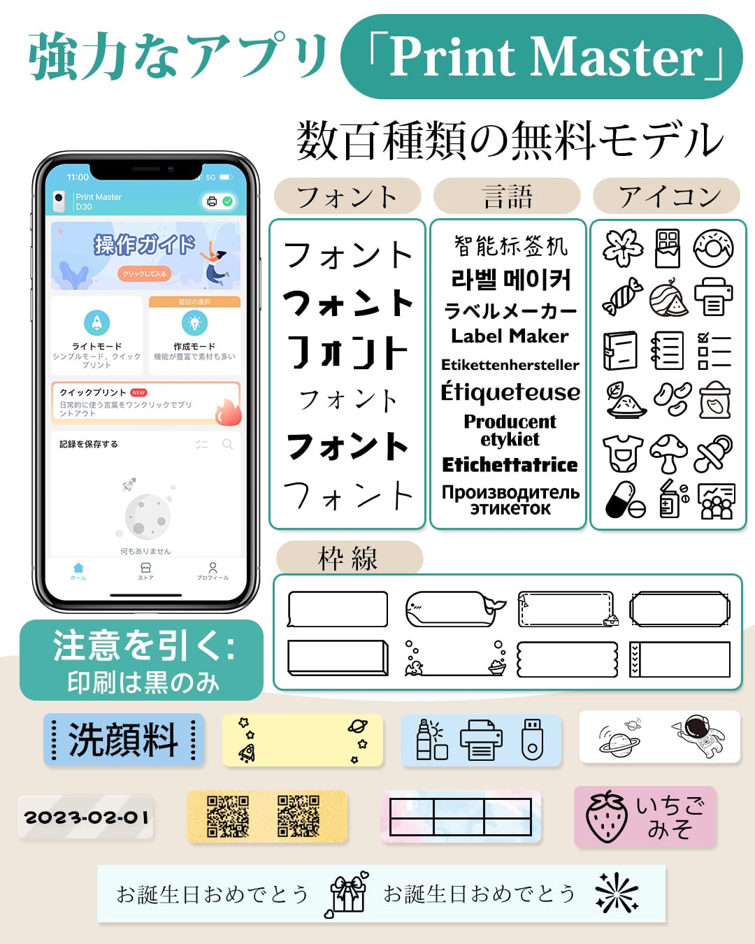 - 「スマートAPP編集,強力な機能」- D30ラベルプリンターは携帯電話やタブレットに対応しており,「Print Master 」APPをダウンロードしてBluetooth接続で編集することができます.APPは簡単で使いやすく,100種類以上のアイコン,枠,テンプレートが無料で使用でき,バーコード,QRコード,日付などの印刷をサポートし,一括印刷もでき,印刷速度が速く,従来のテプラプリンターよりシンプルでスマート,すべての印刷要件を満たす!