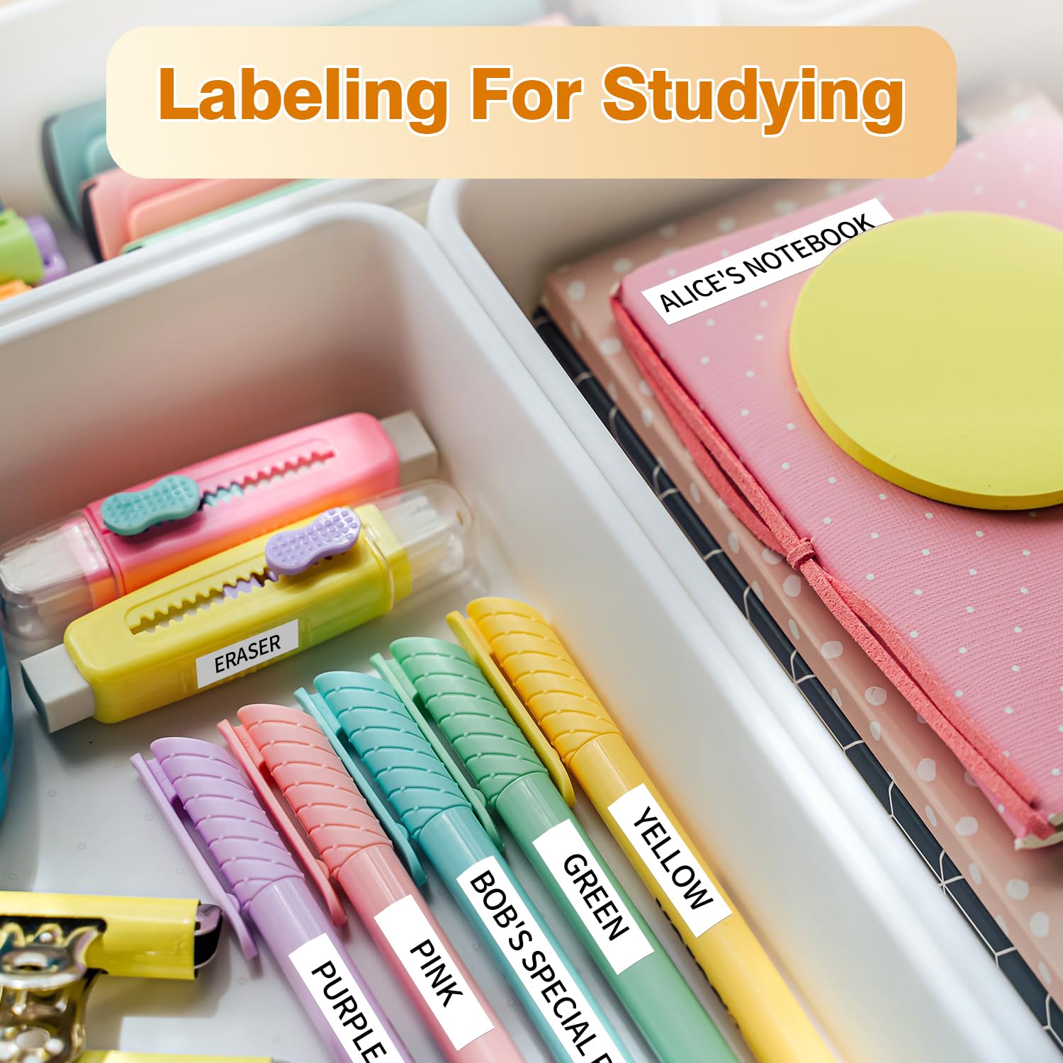- [ Widely use ] The high-quality label maker tapes that adhere to plastic, paper, metal, wood, and glass and is ideal for labeling office supplies, electronic accessories, tools, kitchen items, garage equipment, containers, supply cabinets, storage boxes, personal items, crafts, gifts, files and more for identify items and quickly organize.