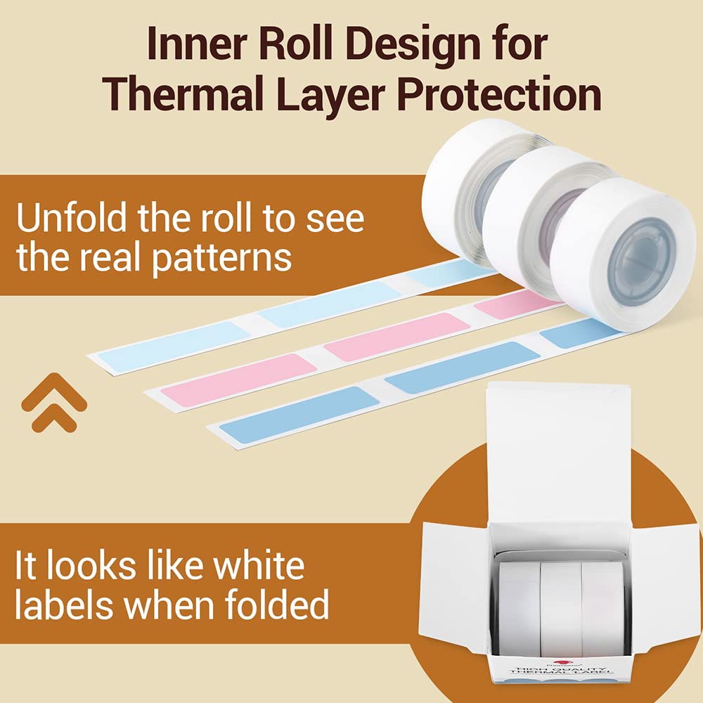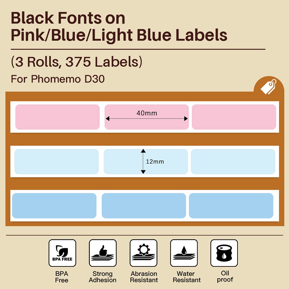 Phomemo D30 etiketler. Mavi/pembe, kendinden yap??kanl?/su ge?irmez/ya?a dayan?kl?/?izilmez, 12 mm x 40 mm, isim, fiyat, s?n?fland?rma etiketleri i?in uygun, D30 etiket yaz?c? makinesi ile uyumlu, 3